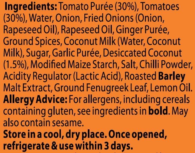 Tomato Purée (30%) Tomatoes (30%) Water Onion Fried Onions (Onion, Rapeseed Oil) Rapeseed Oil Ginger Purée Ground Spices Coconut MILK (Water, Coconut MILK) Sugar Garlic Purée Desiccated Coconut (1.5%) Modified Maize Starch Salt Chilli Powder Acidity Regulator (Lactic Acid) Roasted BARLEY Malt Extract Ground Fenugreek Leaf Lemon Oil : Allergens are shown in CAPITALS